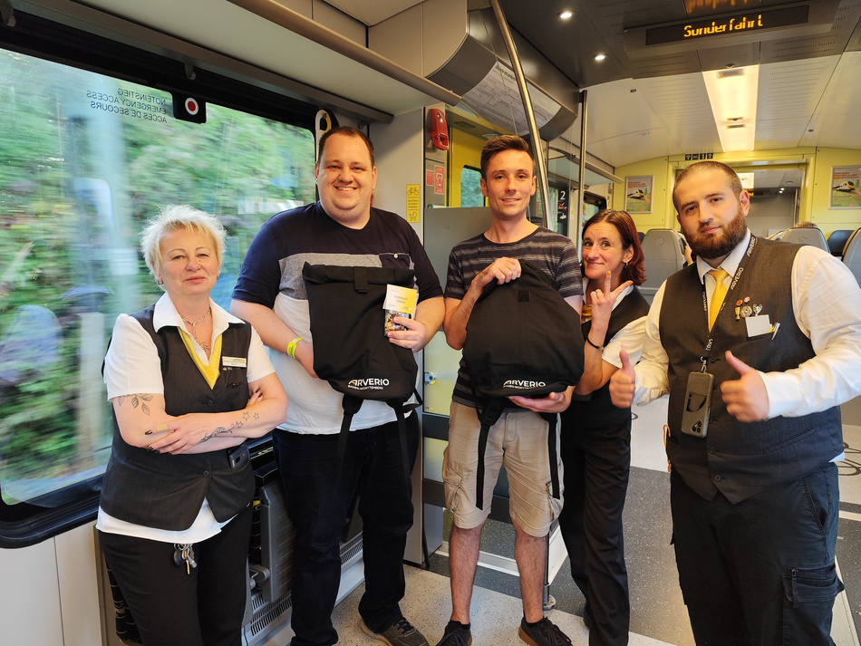Nach einer über zweistündigen Sonderfahrt mit dem einzigen Zwischenhalt in Schwäbisch Gmünd, testeten unsere FAhrgäste ihr Wissen rund um die Strecke, die Eisenbahnwelt und Arverio! Es wurden in zwei Teams um den Sieg gespielt. Dabei kamen die (noch fremden) Fahrgäste miteinander ins Gespräch und genossen die Fahrt zwischen Rems und Rhein durch die wunderschöne Landschaft Würrttembergs und auch Nordbadens.